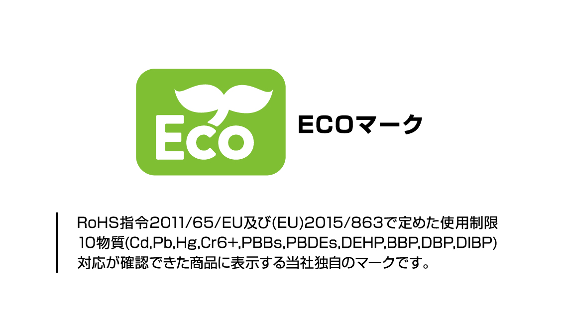 当社の製品では、RoHS指令(2011/65/EU 及び2015/863)で定められた使用制限10物質への対応が確認できた製品には、当社独自の「ECOマーク」を表示しています。