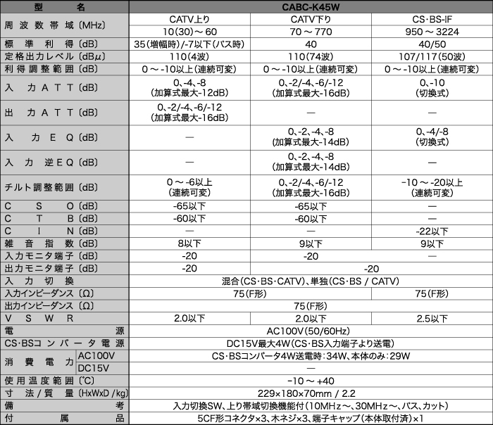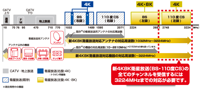 CATV帯域に加えて、CS・BS帯域はBS・110 度CS衛星放送の右左旋円偏波に対応する「950~3224MHz」を増幅。