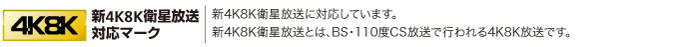 - 新4K8K衛星放送とは、BS・110度CS放送で予定されている4K8K放送です。本器はBS・110度CS放送以外の衛星放送は受信できません。