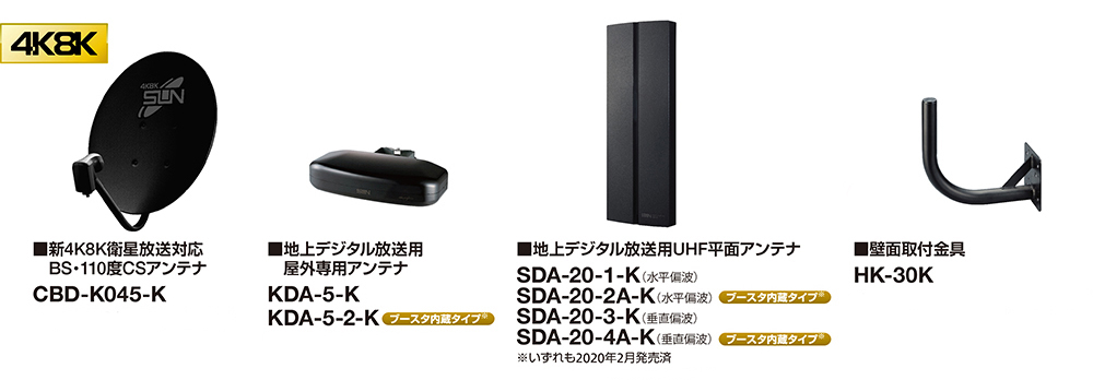 新4K8K衛星放送対応 BS・110度アンテナとして45cmタイプ「CBD-K045-K」を、地上放送用UHFアンテナでは、発売済の平面アンテナ「SDA-20-Kシリーズ」4機種(※2)に加えて、小型デザインアンテナの「KDA-5-K/KDA-5-2-K」2機種を新たに発売。