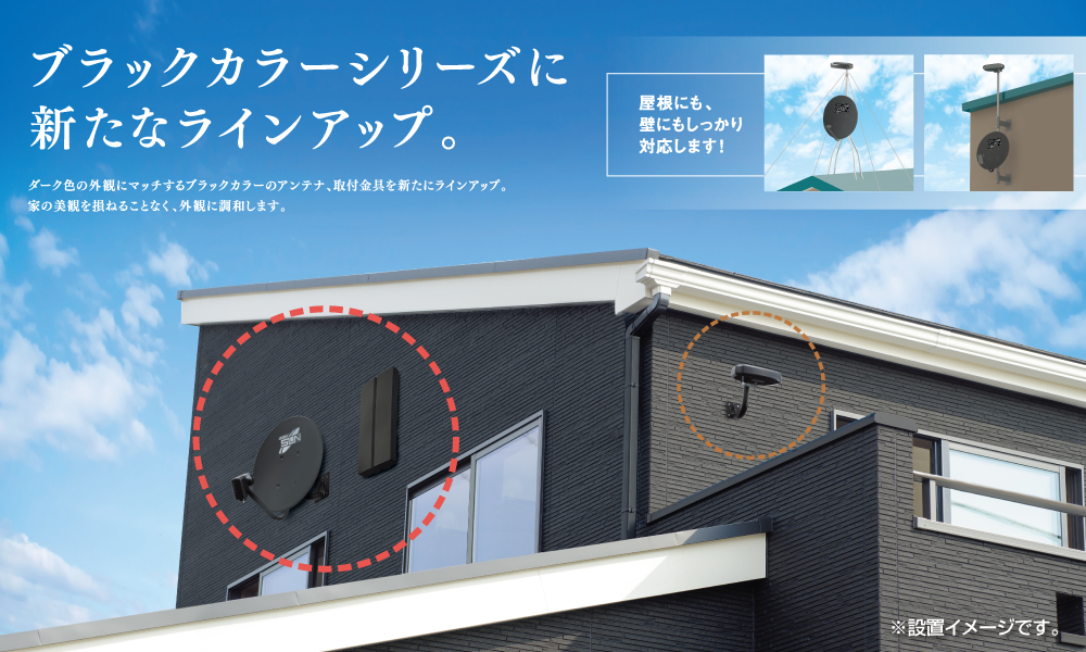 弊社は、ダーク色の外観にマッチしたブラックカラーのBS・110度CSアンテナ、地上デジタル放送用アンテナ、及び取付金具(※1)を新たに発売致します。