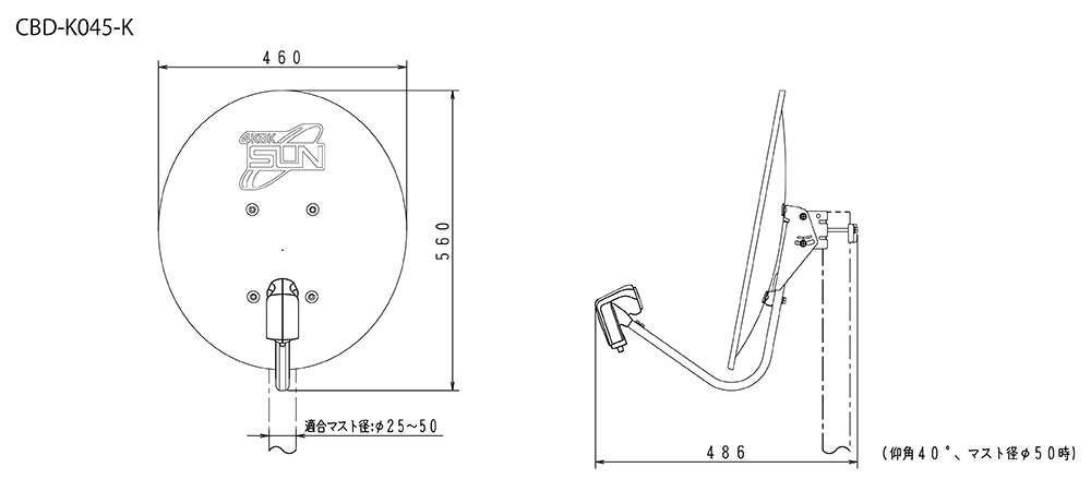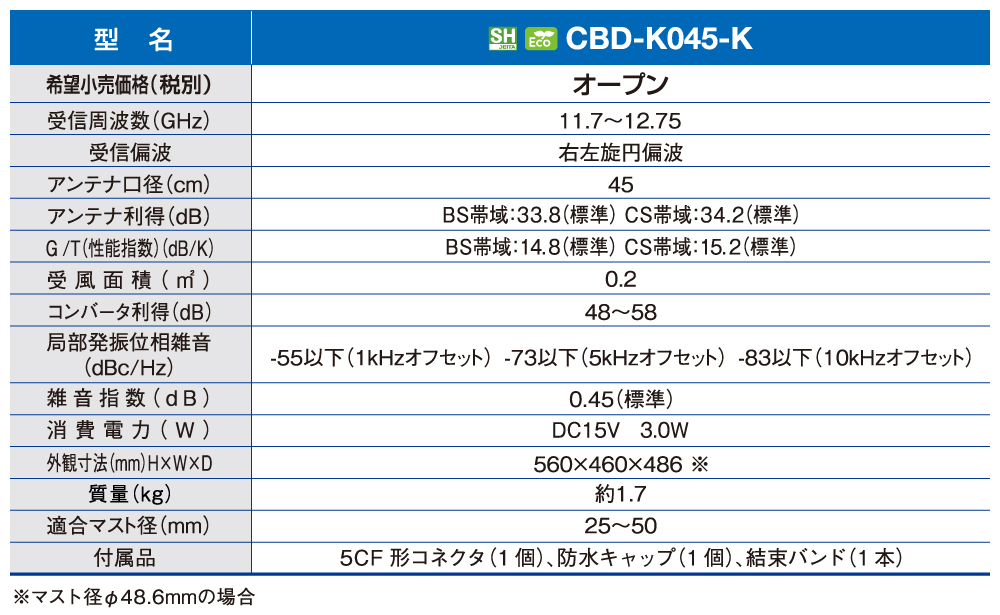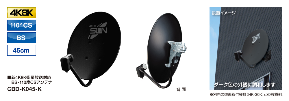 45cmタイプのBS・110度アンテナとして、従来のホワイト色設定 「CBD-K045」「CBD-K045-S」等に加えて、ブラックカラー(黒色)を新たにラインアップ、豊富なラインアップよりお選びいただけます。