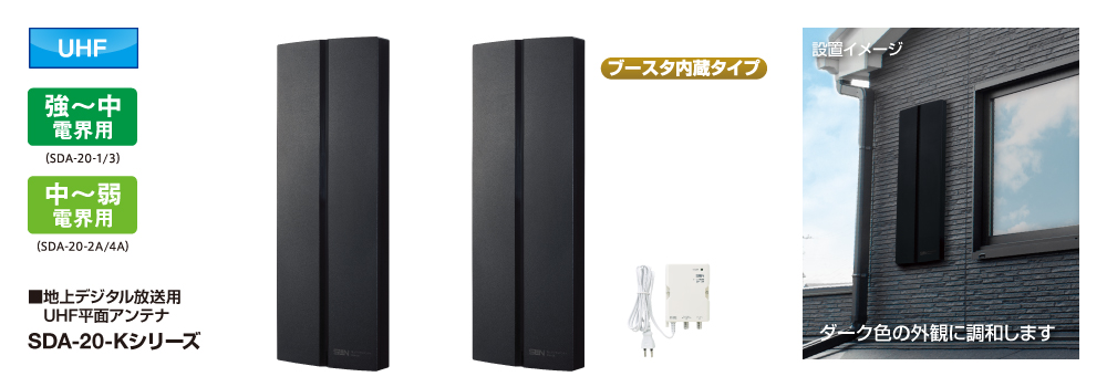 地上デジタル放送用 UHF平面アンテナとして、従来のアイボリーホワイト・グリーンベージュ色設定 「SDA-20シリーズ(W/G)」に加えて、ブラックカラー(黒色)の「SDA-20-1-K(水平偏波専用)」