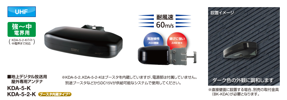 地上デジタル放送用 屋外専用UHFアンテナとして、従来のホワイト色設定 「KDA-5」「KDA-5-2」に加えて、ブラックカラー(黒色)の「KDA-5-K」、ブースタ内蔵タイプの「KDA-5-2-K」をラインアップしました。