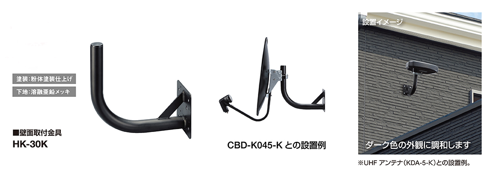 また各種ブラックカラーのアンテナとマッチした取付金具として、壁面取付金具「HK-30K」を発売予定です。従来のカラー設定に加え、バリエーション豊かな各ラインアップとの組み合わせにより、様々なシーンに対応します。