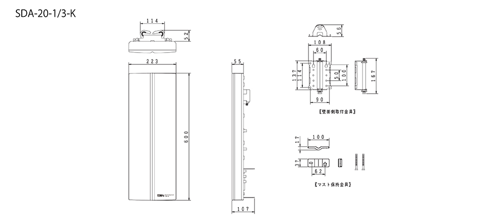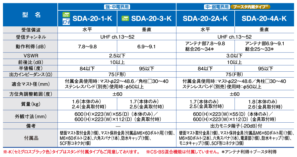 「SDA-20-2A-K(水平偏波専用・ブースタ内蔵)」、「SDA-20-3-K(垂直偏波専用)」「SDA-20-4A-K(垂直偏波専用・ブースタ内蔵)」をラインアップ、豊富なバリエーションよりお選びいただけます。