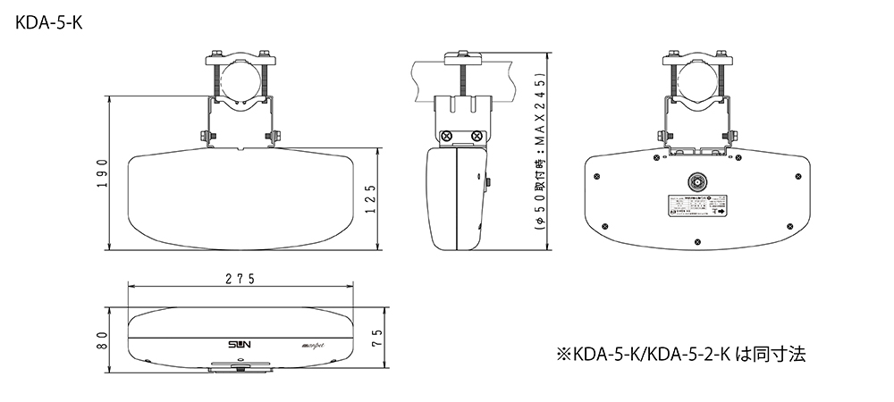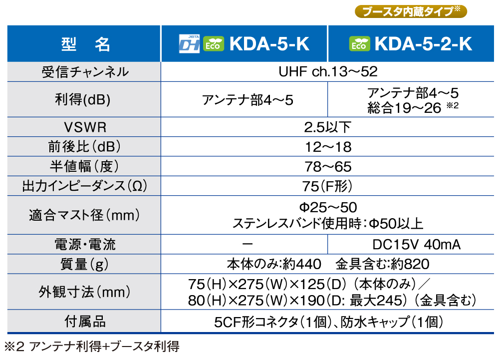 ●小型でスタイリッシュな屋外用アンテナです。動作利得4~5dB(KDA-5-K)、ブースター内蔵タイプは総合利得19~26dB(KDA-5-2-K)取付金具は耐久性・耐食性に優れた「ZAM」を採用しています。水平・垂直偏波対応品です。