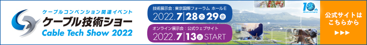 弊社は、7月28(木)~7月29日(金)の会期で開催される『ケーブル技術ショー2022』技術展示会、7月13日(水)から開催されるオンライン展示会へ出展致します。ご来場、心よりお待ちしております。