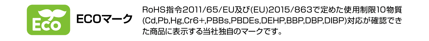 ※RoHS指令2011/65/EU及び(EU)2015/863で定めた使用制限10物質(Cd,Pb,Hg,Cr6+,PBBs,PBDEs,DEHP,BBP,DBP,DIBP)対応