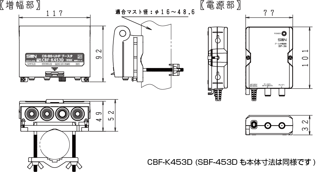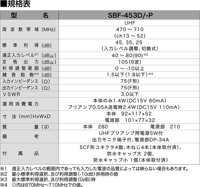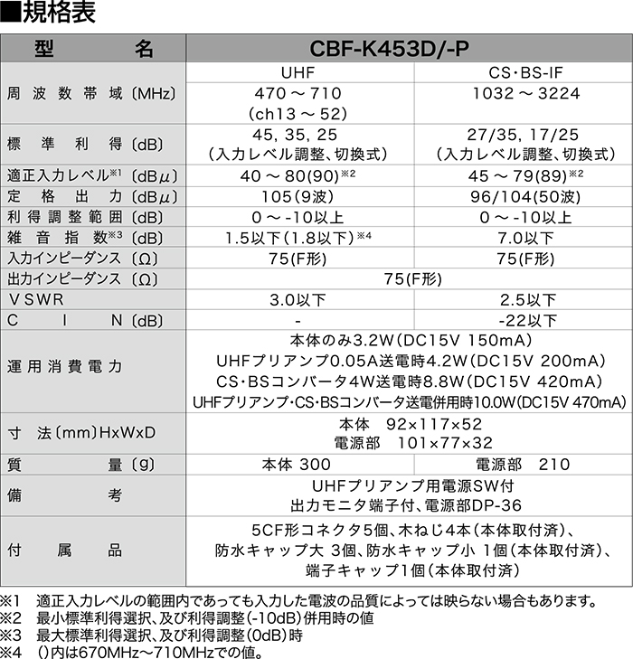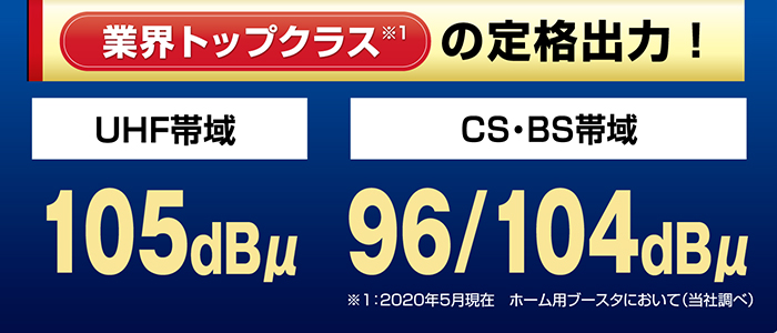 CS・BS帯域は、定格出力が96/104dBμ(CBF-K453D/-Pのみ)、UHF帯域は105dBμと業界トップクラスの出力レベルを実現しています。
