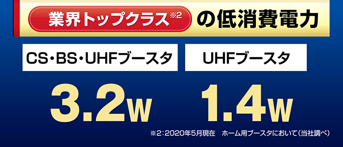 CS・BS・UHFブースタは、3.2W、UHFブースタは1.4Wと、業界トップクラスの低消費電力を実現しています。