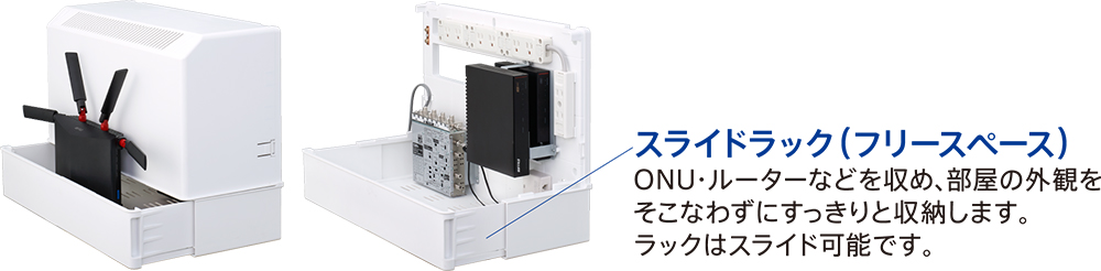 引き出し可能なスライドラック構造を採用。状況に応じ拡張が可能になる為、ルータやモデムなどネットワーク機器の設置・増設にも柔軟に対応します。
