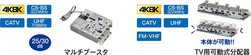 当情報分電盤(コムスペース)は、可動式分配器(6分配、8分配)を搭載したモデルをラインアップしています。情報分電盤専用のマルチブースタは、可動式分配器との併用により最適なケーブル配線と、優れた施工性を実現します。