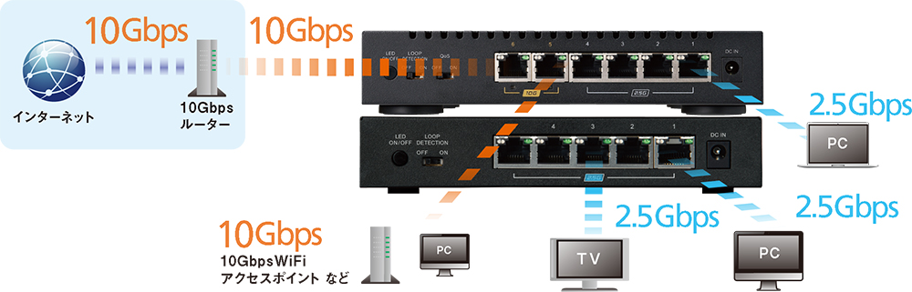 ※10Gbps通信には対応の機器のご使用と、Cat.6Aの配線が必要です。