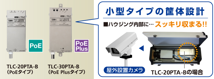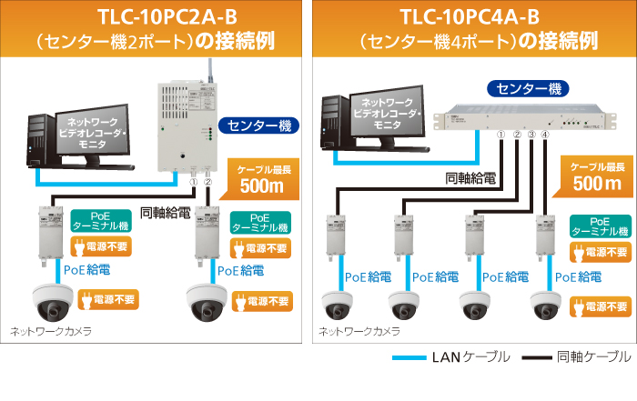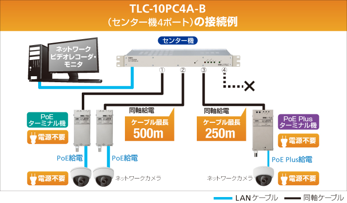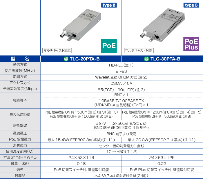弊社は、現在発売中の「PoE対応TLCモデムシリーズ」において、センター機「TLC-10PC2A-B」「TLC-10PC4A-B」2機種、ターミナル機「TLC-20PTA-B」「TLC-30PTA-B」2機種、計4機種を「タイプBシリーズ」として新たに発売します。 PoE(及びPoE Plus)は、イーサネットで使用するLAN(UTP)ケーブルを利用し、PoEに対応した各種端末機器(ネットワークカメラ、アクセスポイントなど)に電力を供給する技術です。 当タイプBシリーズは、一般的な通信方式となるユニキャスト運用※1に加え、マルチキャスト運用※2にも対応。通信速度:実効速度65Mbps(TCP)/90Mbps(UDP)※3、伝送距離を500m(PoE Plusは250m)とする事で、安定した通信を実現します。