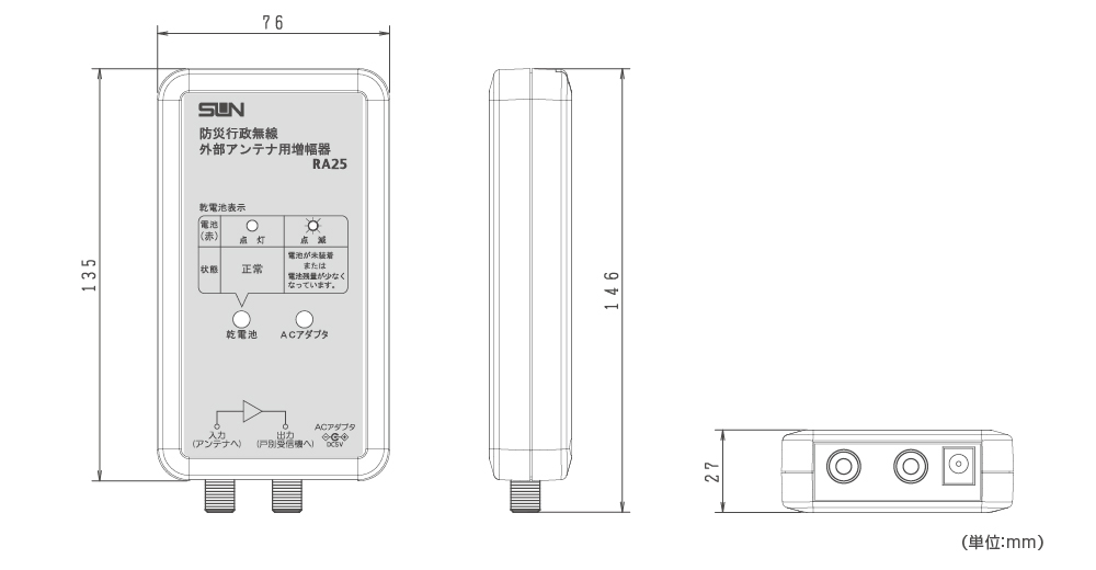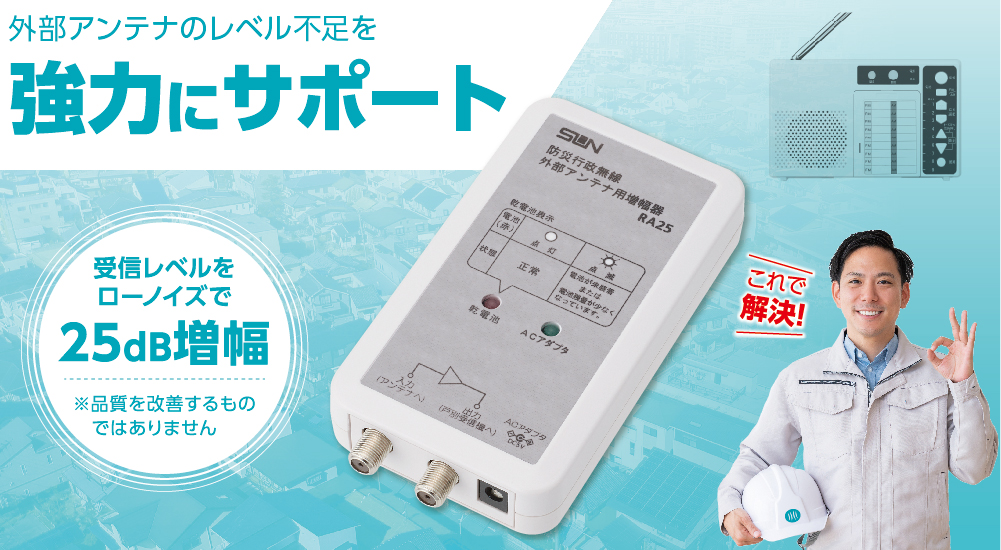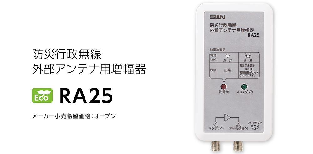 弊社(サン電子株式会社 本社:新宿)は、防災行政無線(60MHz)のデジタル戸別受信機における、外部アンテナ用増幅器「RA25」を新たに発売します。