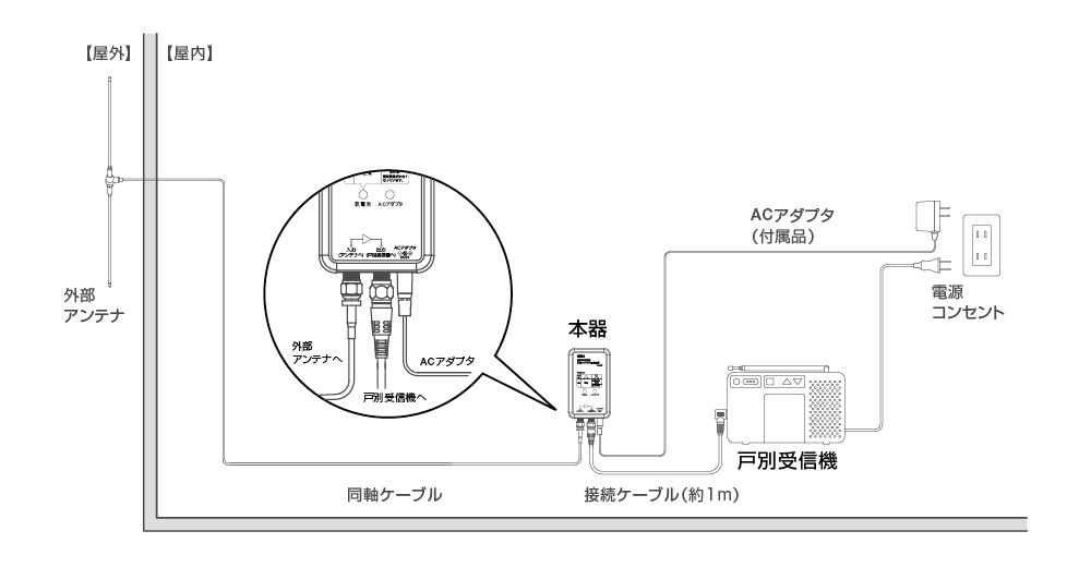 外部アンテナと戸別受信機の間に挿入、電源を接続するだけ
