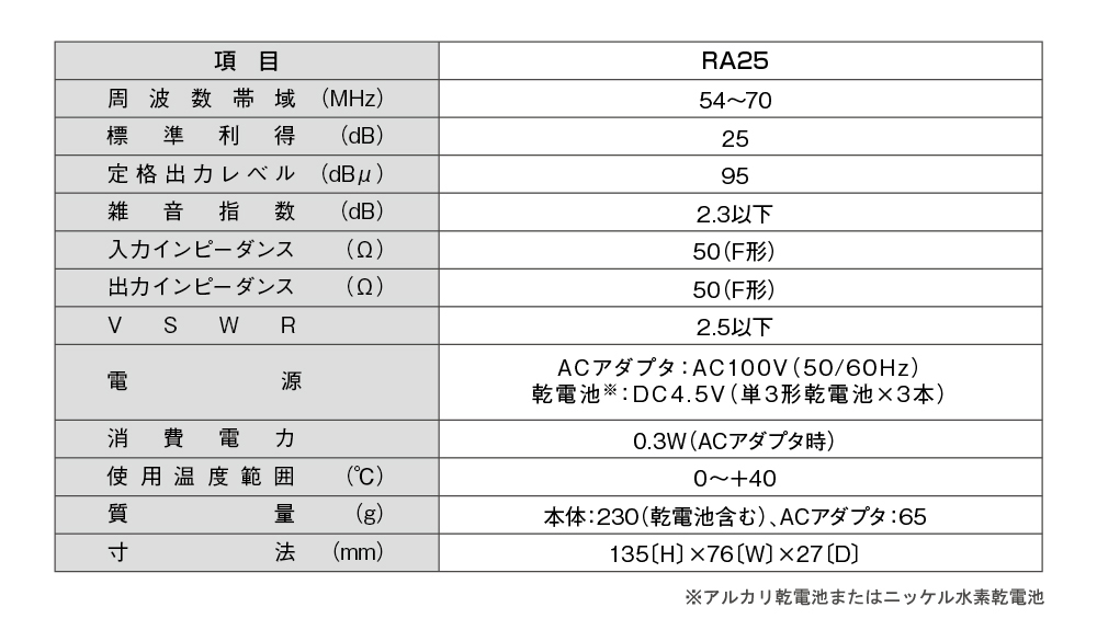当商品は、ローノイズで受信レベルを25dB増幅、戸別受信機への入力レベルを十分に確保することで、フェージングなどのレベル低下時においても安定受信を実現します。