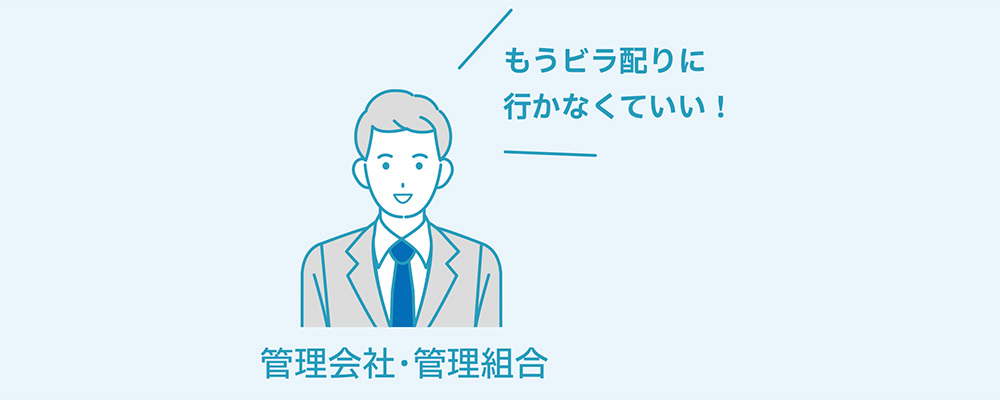 マンションやアパートの”ビラ配り” を ビラ配信”にすることで、マンションの管理業務において、ビラ配りの為に現地に行く必要がなくなり、省力化・コスト削減を実現します。