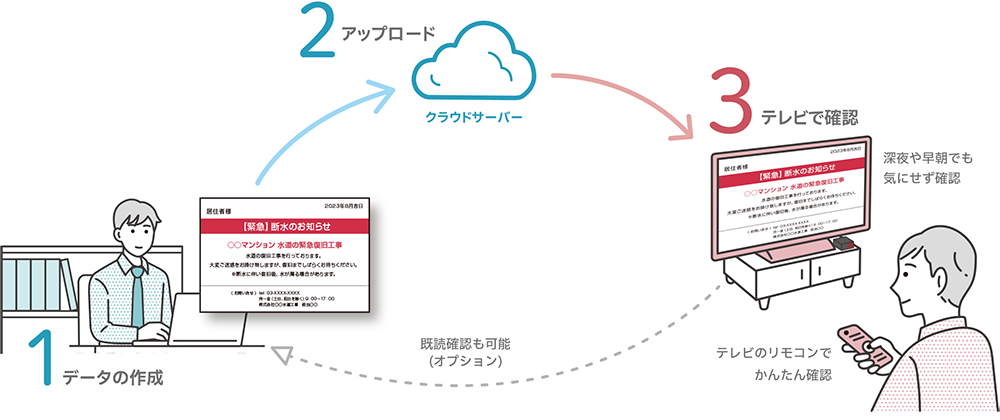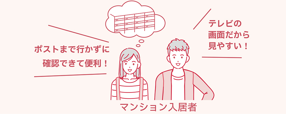 当サービスは、住民の方へ配布していた告知ビラをオンラインで配信することで、入居者宅のテレビで見ることができるサービスです。