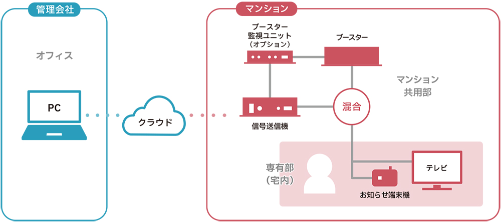 テレビ設備に「リモぽす専用機器」を追加設置するだけで、システムに導入が可能です ほとんどのマンション・アパートに導入が可能です