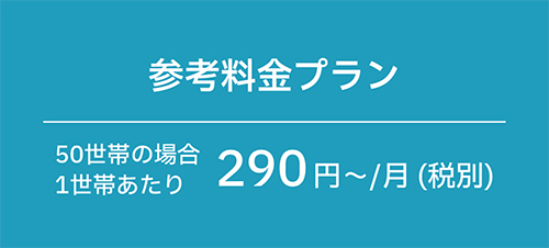 右記価格は、50世帯のマンションを想定した共用部機器取付工事を含む月額費用(税別)となります。建物設備の内容によって異なる場合がございます。リモぽすアプリクラウド利用料は、右記価格には含まれておりません。サービスプランは「リモぽすベーシックプラン」となります。(※リモぽすベーシックプランには、配信ログ確認及びブースター監視ユニットは含まれておりません。)インターネット回線導入に伴う新規申込や初期費用及び回線使用料・プロバイダ利用料は別途必要となります。機器取付スペースがない場合や配線・配管がない場合は、付帯工事が別途必要となります。各戸への「お知らせ端末」は1台とし、配布及び設置・調整工事は別途必要となります。