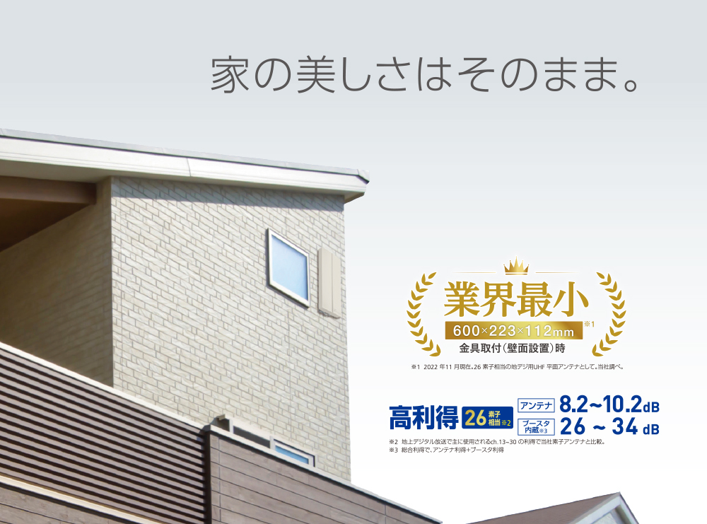 26 素子相当 ※2 の地デジUHF平面アンテナとして、業界最小サイズ(壁面設置時 ※1)となるコンパクトな設計を採用。アンテナ動作利得は8.2~10.2dB、ブースタ内蔵タイプは総合利得で26~34dBと高利得を実現しています。