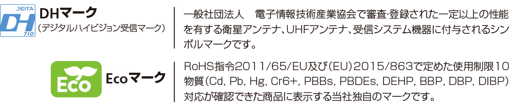 DHマーク(デジタルハイビジョン受信マーク)は、一般社団法人 電子情報技術産業協会で審査・登録された一定以上の性能を有するUHF アンテナ、UHF帯域(ch13~ch52)に対応したブースタに付与されるシンボルマークです。