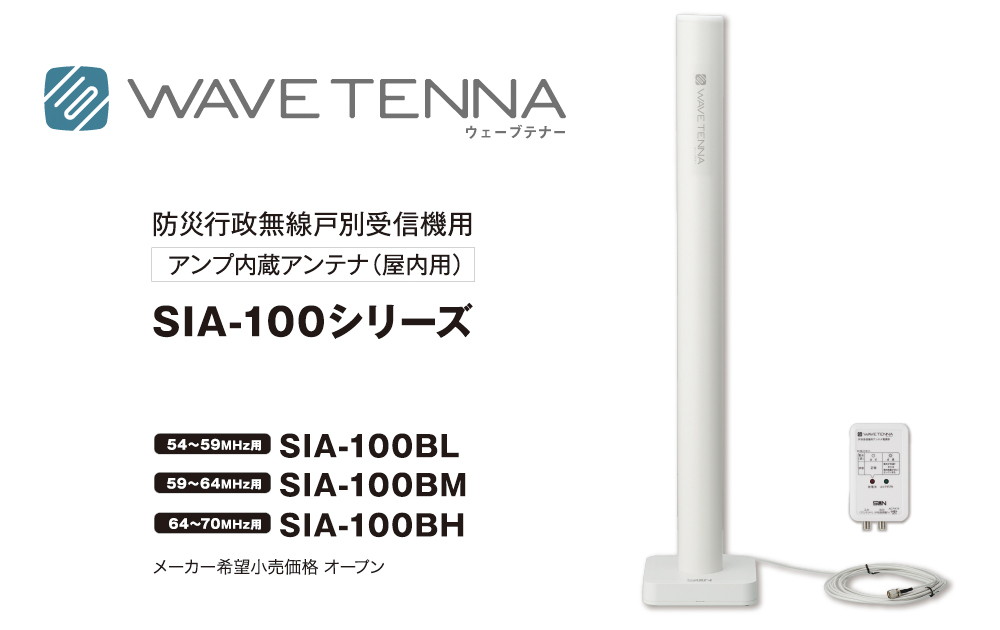 市町村防災行政無線(同報系)で用いられている戸別受信機用の屋内アンテナとして、Low 帯域用(54~59MHz)の「SIA-100BL」、Mid 帯域用(59~64MHz)の「SIA-100BM」、