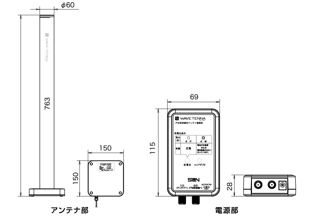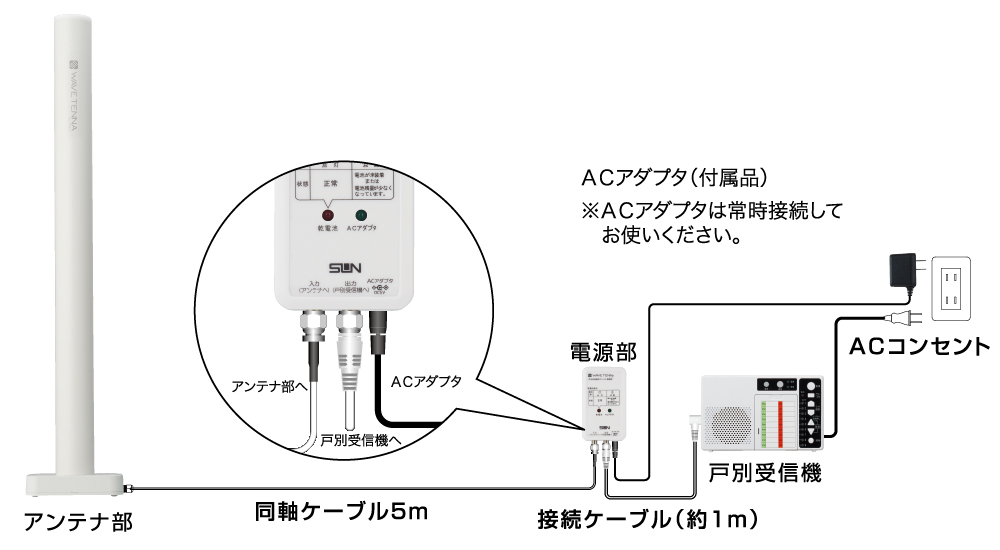※当アンテナはアンプ機能を内蔵している為、付属の電源部を接続する必要があります。詳細は接続例等をご確認ください。