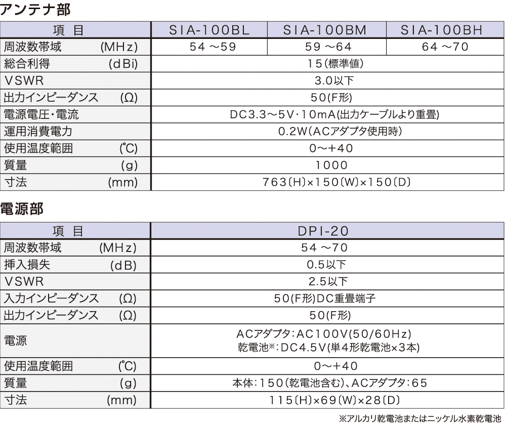 Hi 帯域用(64~70MHz)の「SIA-100BH」、帯域別に3機種を設定。筐体内部に高性能アンプを搭載することで、小型で高利得を実現しました。