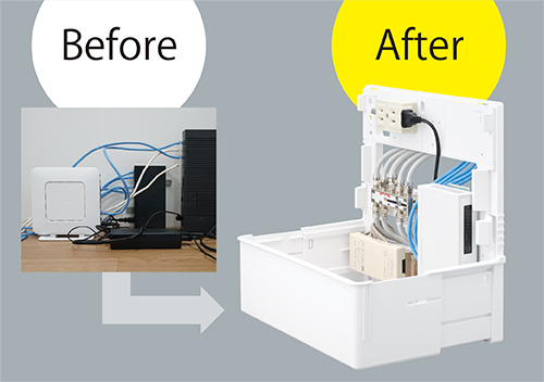 ネット、電話、テレビの配線・機器を一つにスッキリ、コンパクトに収納