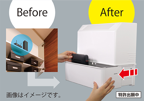 当商品はテレビ・インターネット・電話の各種機器をスッキリと収納する、住戸用の情報BOXです。従来の情報分電盤(コムスペース)シリーズ同様、スライドラック構造(特許出願中)を採用することで、アクセスポイントやルータなどネットワーク機器の設置が可能なフリースペースを搭載。