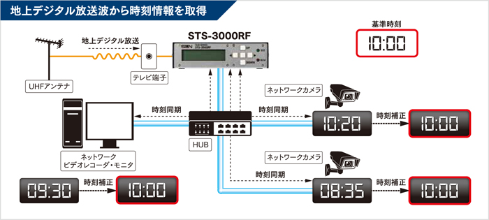 どこにでもある、地上デジタル放送の信号から時刻情報を受け取り、ネットワーク機器の時刻情報を同期します。 標準電波(電波時計)やGPSが受信しにくい場所、ネットワークから分離された場所などでも、地デジの信号を取得するアンテナ、テレビ端子等があれば、各種ネットワーク機器へ時刻情報の提供が容易に行えます。