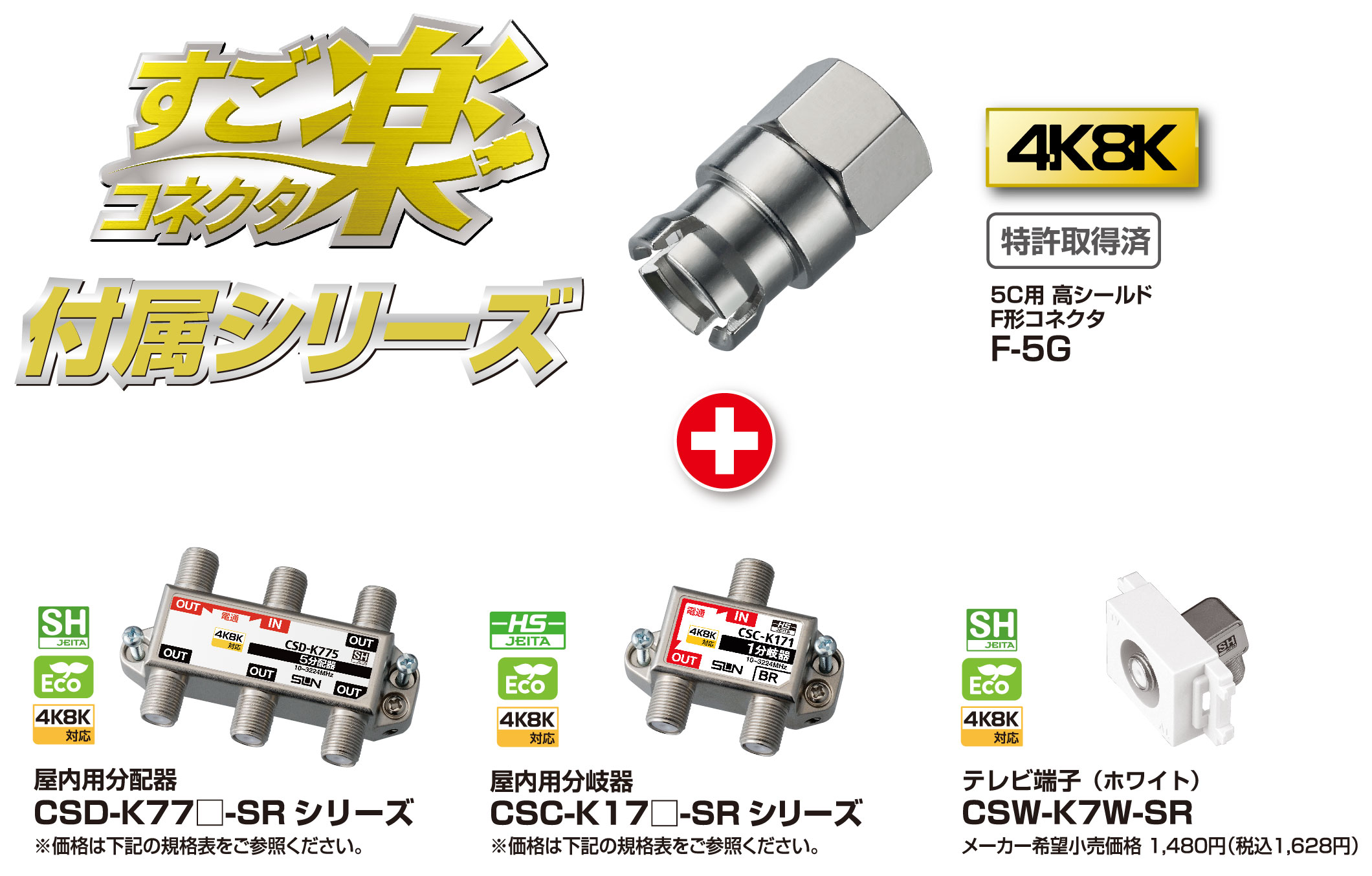 弊社は、省施工と電波漏洩防止をコンセプトとした、高シールド・省施工F形コネクタ「すご楽コネクタ(F-5G)」を端子数分付属した、テレビ端子、分岐器、分配器、各シリーズをラインアップ致します。