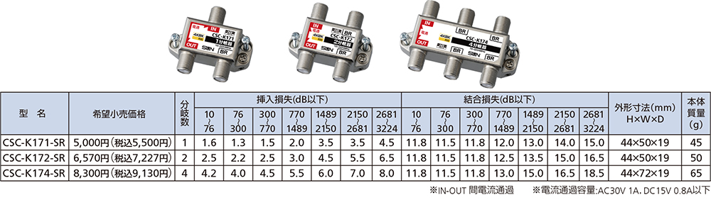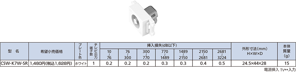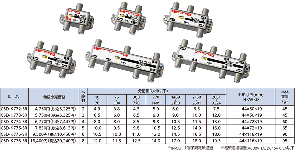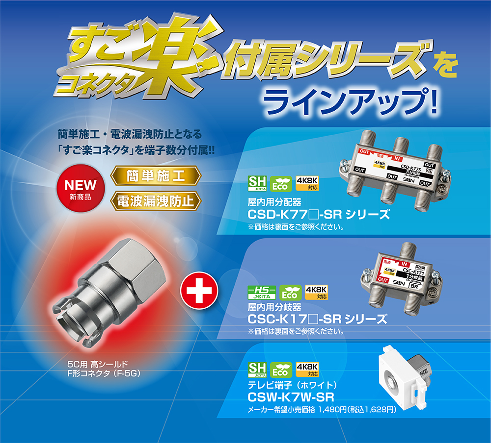 すご楽コネクタ付属シリーズとして、分配器各種(2~8分配器 CSD-K77□-SR)、分岐器各種(1~4分岐器 CSC-K17□-SR)、テレビ端子(入力端子可動型: CSW-K7W-SR)の各シリーズをラインアップしました。