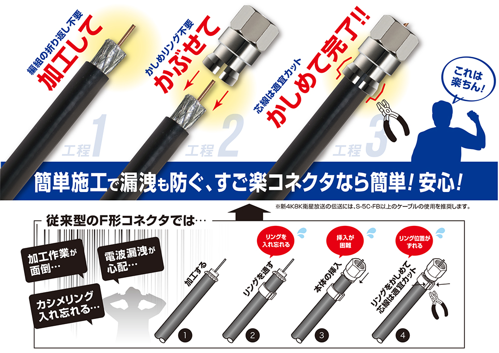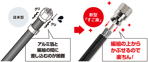 付属の「すご楽コネクタ」は従来のF形コネクタに付属するかしめリングを廃止、コネクタ本体を一体構造として同軸ケーブルを覆う画期的な構造を採用(特許取得済)することで、従来より高いシールド性を確保すると共に、省施工を実現しています。従来のコネクタ加工で発生するケーブル加工時の編組の折返し作業や、かしめリングの挿入、ケーブル内部(編組と絶縁体の間)へのコネクタ挿入など、煩わしい作業から解放され、ケーブル加工後にコネクタを被せペンチでかしめるだけで加工を完了することができます。