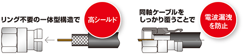 当社独自の構造設計により、コネクタ本体がしっかりとアルミ箔・編組を押さえ、従来F形コネクタよりも高いシールド性を実現、電波漏洩をしっかりと防止します。