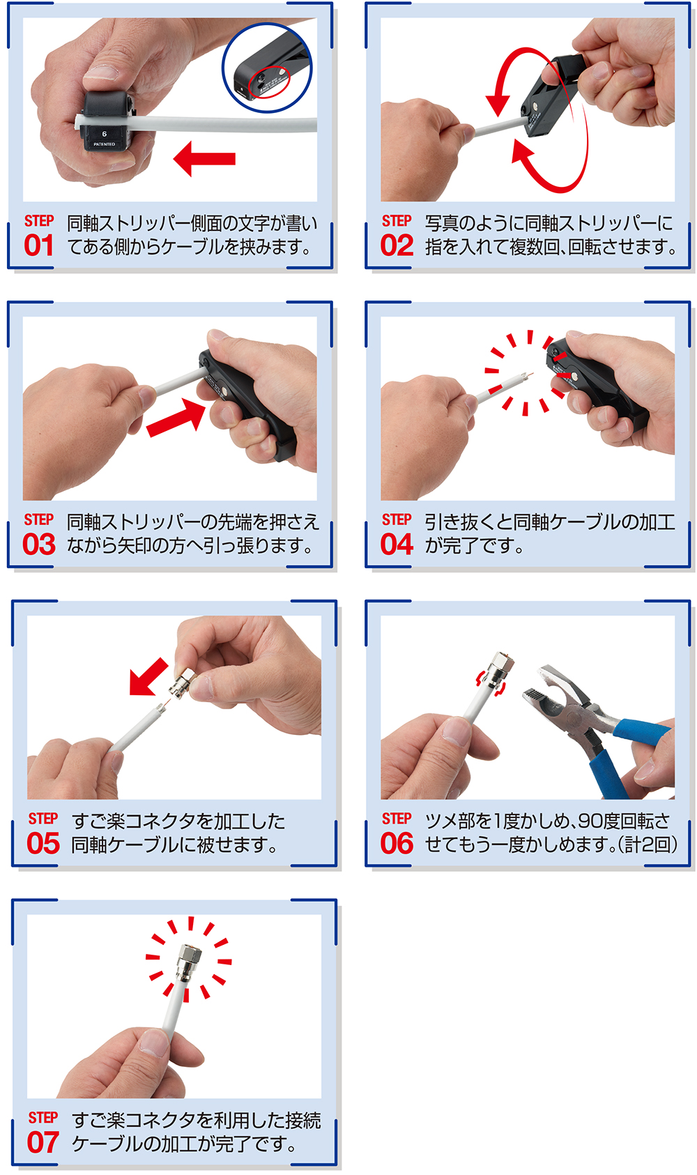 同軸ケーブルの加工に最適、ストリッパーもラインアップ。すご楽コネクタ使用時のケーブル加工は、編組の折り返しも不要で、規定寸法に剥くだけ、更に同軸ストリッパーがあれば、あっという間にコネクタ加工が完了します。