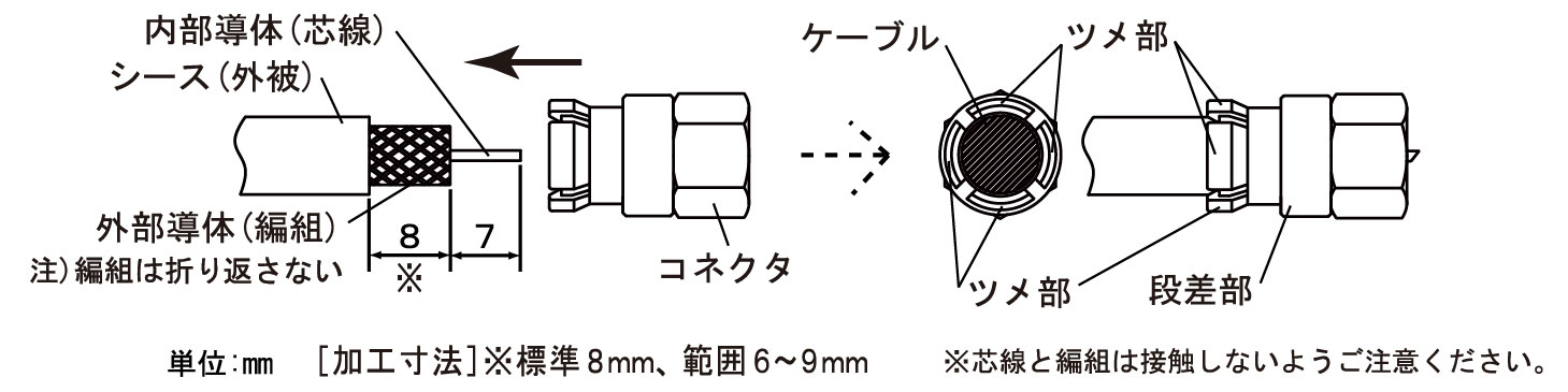 付属のすご楽コネクタは、同軸ケーブルを規定寸法にカット・剥離し、コネクタ本体をかぶせて、ペンチでかしめるだけ! 従来のF形コネクタのように、コネクタ本体を同軸ケーブルのアルミ箔と編組の間に差し込む作業も不要、編組の折り返しも不要です。煩わしい かしめリングの挿入・入れ忘れも発生せず、簡単・安全に作業ができます。