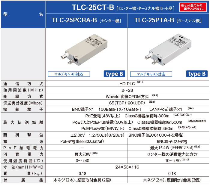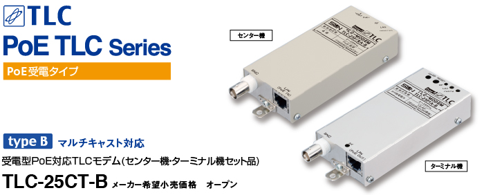 弊社は、現在発売中の「PoE対応TLCモデムシリーズ(type Bシリーズ)」の新たなラインアップとして、容易にPoE延長が可能となる受電タイプのTLCモデム、「TLC-25CT-B」(センター機・ターミナル機セット品)を発売致します。