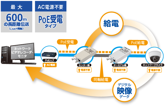 PoE給電時最大600m(※)、AC電源不要のPoE受電タイプ