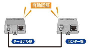 センター機、ターミナル機の間の認証は機器の電源を入れると自動で行われますので、接続が容易に行えます。 ※PoE対応TLCモデム以外に接続するネットワーク機器は別途、認証の設定が必要です。