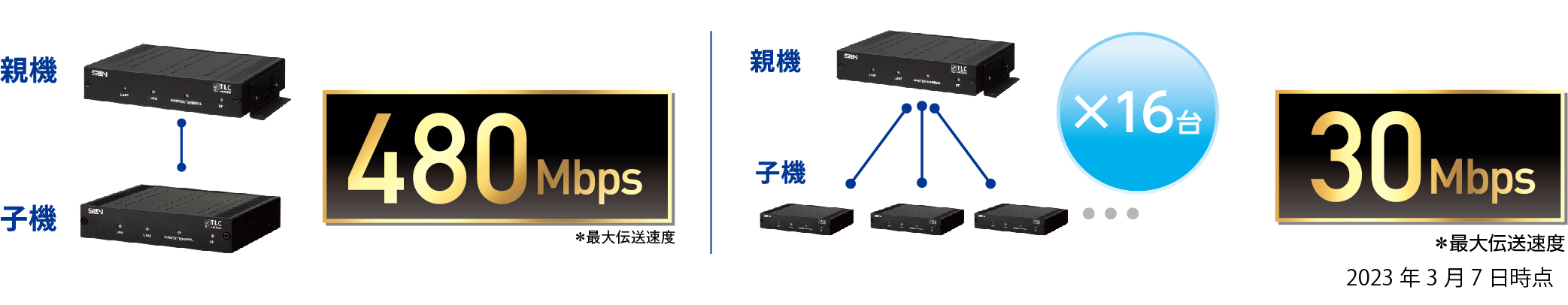 親・子1対1の接続なら、最大伝送速度480Mbpsを実現、また子機は最大16台の接続が可能で同時通信時には1台あたり、最大伝送速度30Mbpsの通信速度を実現します。(※ 2023/3/7現在 通信速度測定方法の変更により速度表示を更新。いずれも親・子間の通信において)