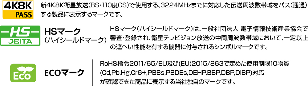 - 新4K8K衛星放送(3224MHz)の信号を通過させる4K8Kパスに対応。BS・110 度CS衛星放送の右左旋円偏波に対応する「1032~3224MHz」の信号を通過させることができます。
