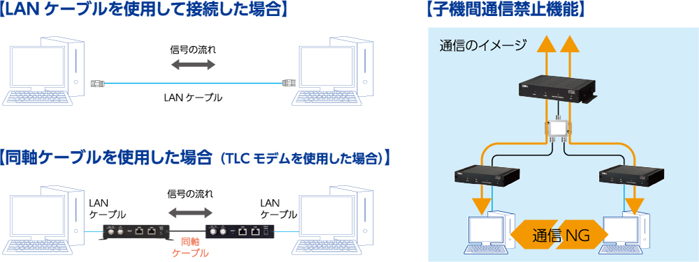 TLC(TV Line Communication)とは、テレビ受信用に使用している同軸ケーブル(TVケーブル)を利用してネットワークを構築しデータ通信を行うシステムです。同軸ケーブルの配線があれば、LANケーブルの配線が困難な場所や、障害物のために無線通信ができない場所でも、通信が可能になります。