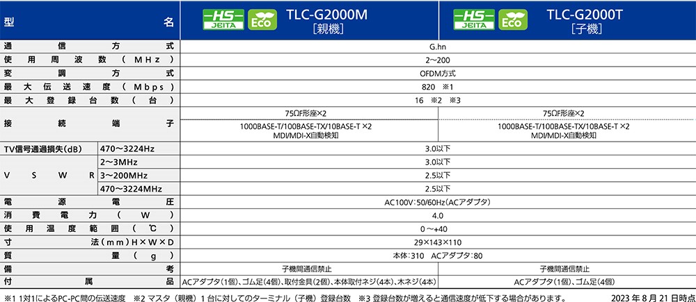 高速タイプのTLCモデム、G2000モデル(親機:TLC-G2000M、子機:TLC-G2000T)をラインアップ致します。
