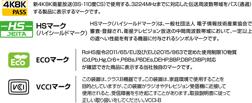 - 新4K8K衛星放送(3224MHz)の信号を通過させる4K8Kパスに対応。BS・110 度CS衛星放送の右左旋円偏波に対応する「1032~3224MHz」の信号を通過させることができます。