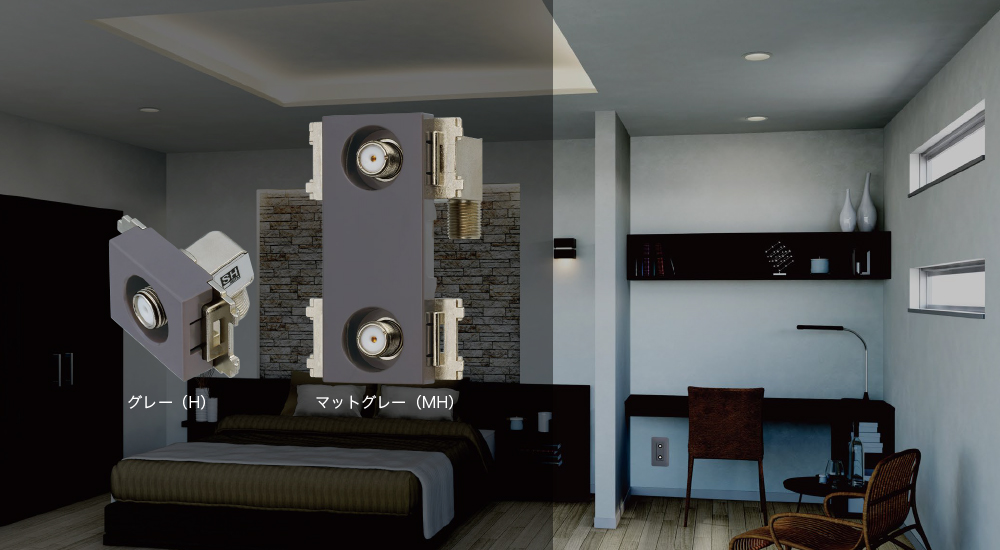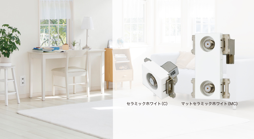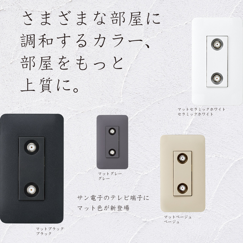 当シリーズは「さまざまな部屋に調和するカラー」をテーマに、落ち着きのある「マット」仕上げを施すことで、さまざまな壁面に調和します。テレビ端子・直列ユニットにおいて、従来の光沢色となるホワイト、セラミックホワイト、グレー、ベージュに加えて、テレビ端子に「マットセラミックホワイト」「マットグレー」「マットベージュ」「マットブラック」を追加、豊富なカラーバリエーションを設定することで、さまざまなシーンに対応いたします。