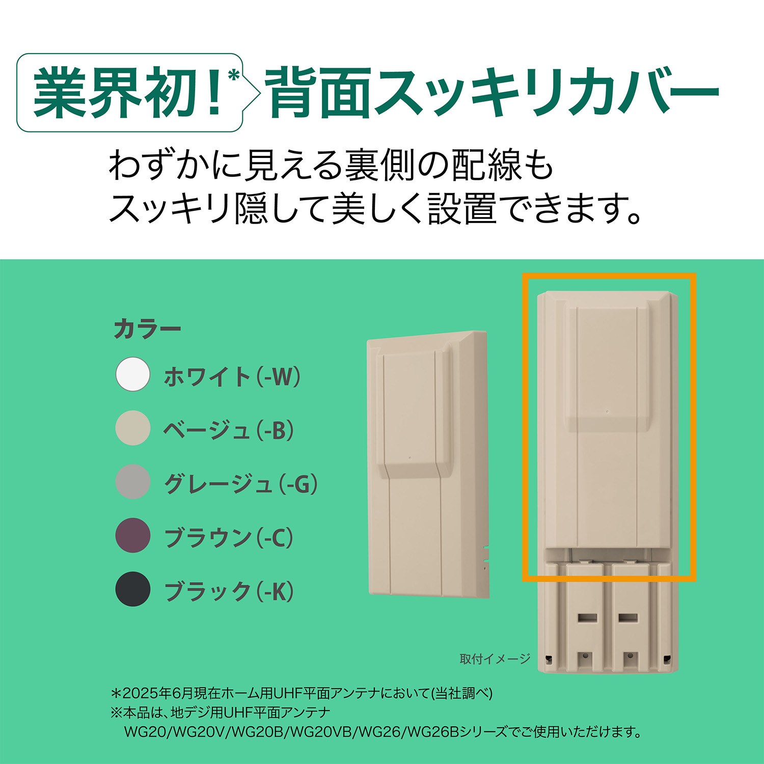 当社のUHF平面アンテナ、WGシリーズ専用の背面スッキリカバー。わずかに見える裏側の配線も、スッキリ隠して美しく設置できます